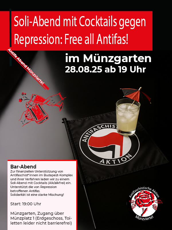 Neben Maja werden europa- und bundesweit Antifaschist*innen im Budapest-Komplex angeklagt und inhaftiert. Zur finanziellen Unterstützung bei der Deckung ihrer Verfahrenskosten, laden wir am 28.08.25 zu einem Soli-Abend mit Cocktails (Alk/alkfrei) ein. Kommt vorbei, nehmt ein paar Drinks und unterstützt die von Repression betroffenen Antifas. Solidarität ist eine starke Mischung!